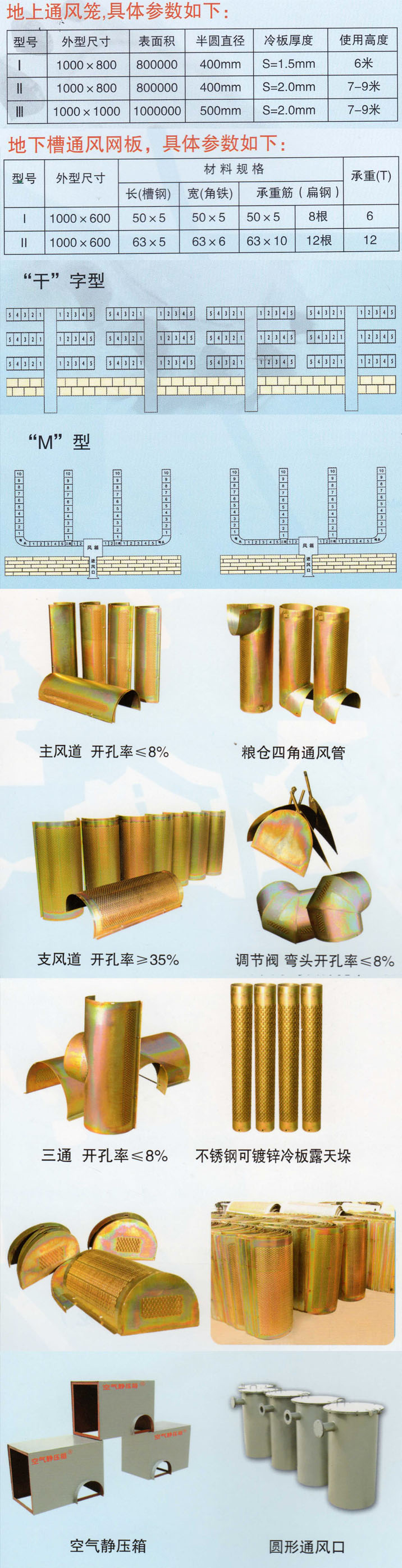 地上风道可根据不同的通风目的的需要,灵活改变支风道间距,长度和条数,任意调整风道布局形式。 互换性强,组装好的风道接风严密,连接牢固,整体性好,抗挤压,不漏粮。产品采用国内外冷轧钢板,冲压成型,强度高,表面采用彩镀防腐处理新工艺,其工艺在全国同行中居领先地位。